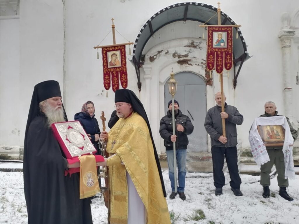 После Литургии крестным ходом по ноябрьскому снегу прошли верующие, прославляя одного из покровителей Псковской земли, сообщает сайт Великолукской епархии.